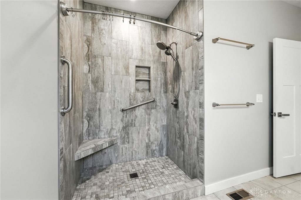 The primary suite features a custom walk-in closet and a fully porcelain-tiled shower. Thoughtful exterior touches include step railings, front porch fencing, and exquisite landscaping with lighting.